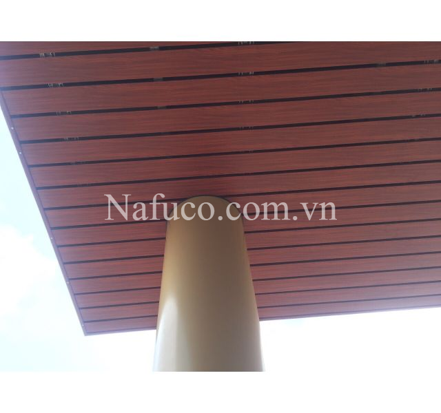 Trần B130 màu vân gỗ, thanh trần được làm bằng nhôm, không ảnh hưởng bởi thời tiết, phù hợp hơn với không gian ngoài trời.
